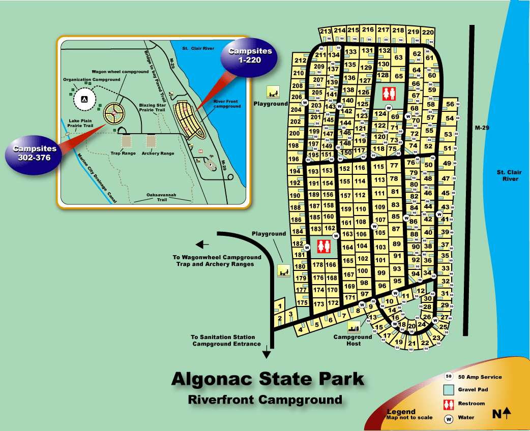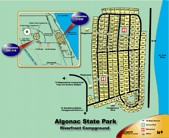 Click here to download a nice printable map (Adobe pdf) of the entire Algonac State Park which you can print.Click here to display a large version (one that you can actually read) of the Campground map shown below. You can print the map by right-clicking on it and selecting print.
