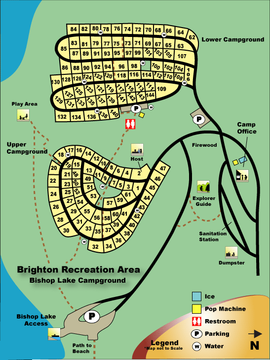 Brighton Recreation Area provides 4,947 acres of recreation for park visitors to use. The area has a combination of high, irregular ranges of hills, interspersed with a number of attractive lakes. Brighton Recreation Area has several miles of trails available for equestrian, mountain biking, and hiking. Oak forest, thick hedgerows and open spaces blend on the uplands while grassy marshes, shrub marshes and dense swamp timber mark the lowlands.Campground Info from the State website