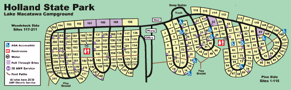 Click here to download a nice printable map (Adobe pdf) of the Holland State Park campgrounds which you can print.Click here to display a large version (one that you can actually read) of the Campground map shown below. You can print the map by right-clicking on it and selecting print.