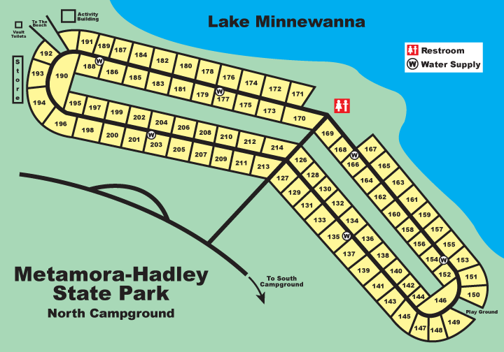 Click here to download a nice printable map (Adobe pdf) of the Metamora-Hadley State Recreation Area which you can print. This is a big download and may take a few minutes.Click here to display a large version (one that you can actually read) of the North Campground map shown below. You can print the map by right-clicking on it and selecting print.