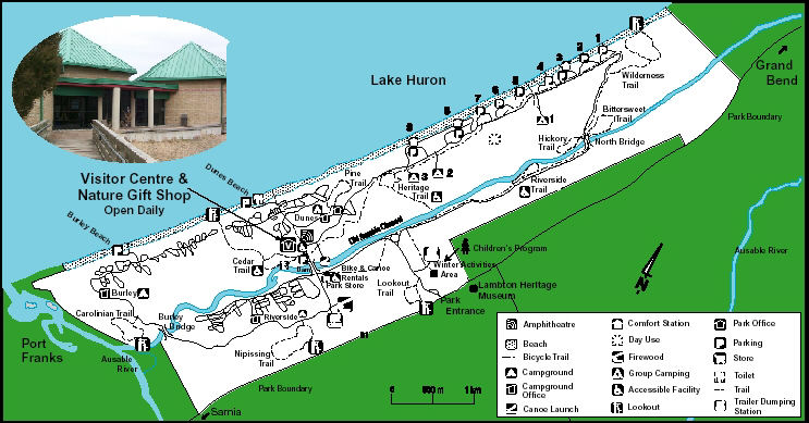Drive up to Port Huron on I-94. Go across the Blue Water bridge to Canada. Drive east on 402 for about 21½ miles to Hwy 21. Go north on 21 about 23 miles to the park.Should be about a 2-hour drive for most of us.
