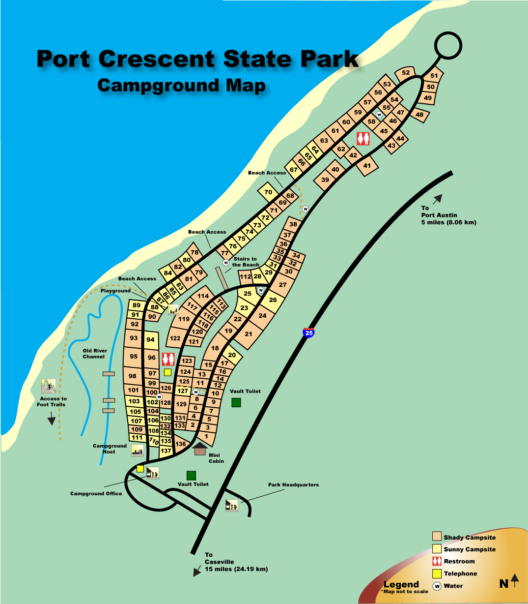 Click here to download a nice printable map (Adobe pdf) of the Port Crescent State Park which you can print.Click here to display a large version (one that you can actually read) of the Campground map shown below. You can print the map by right-clicking on it and selecting print.